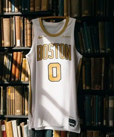 The Celtics’ new City Edition gear features a white jersey with gold lettering and numbers. The gold is a nod to Boston’s 18 championships, the most among all NBA teams.